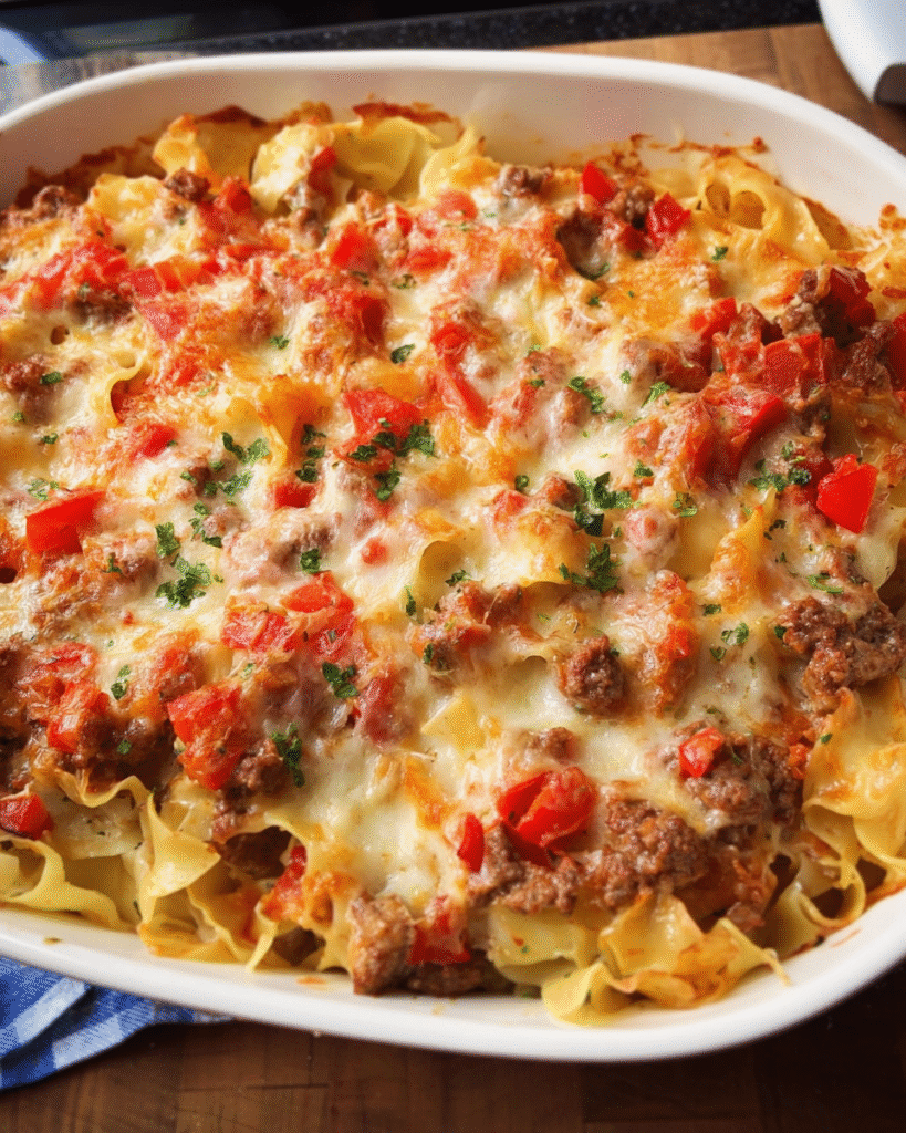 A creamy, hearty beef and cheese casserole made with egg noodles, seasoned ground beef, sour cream, Parmesan, and melted Cheddar cheese, baked until golden and bubbly.