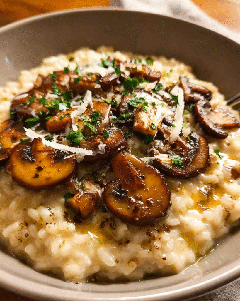 A rich and comforting creamy mushroom risotto made with arborio rice, sautéed garlic mushrooms, Parmesan cheese, and a silky broth-based sauce.