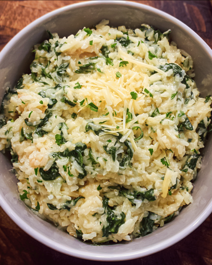 Many home cooks refer to this simplified version as an easy spinach rice recipe because it uses fewer dairy ingredients while keeping the flavor vibrant.
