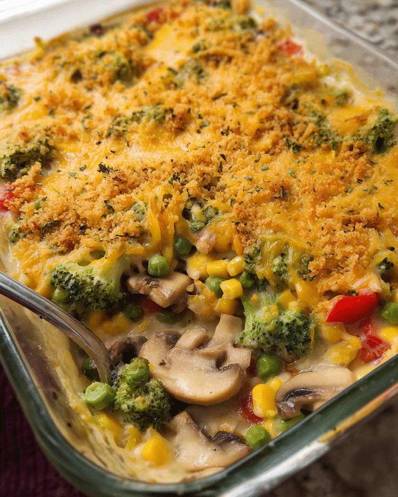 The contrast is what makes it memorable. Sweet corn and peas add bursts of flavor, broccoli brings structure, and mushrooms provide depth. Once coated in the creamy base and topped with crisp breadcrumbs, everything melds into a cohesive, satisfying bake.