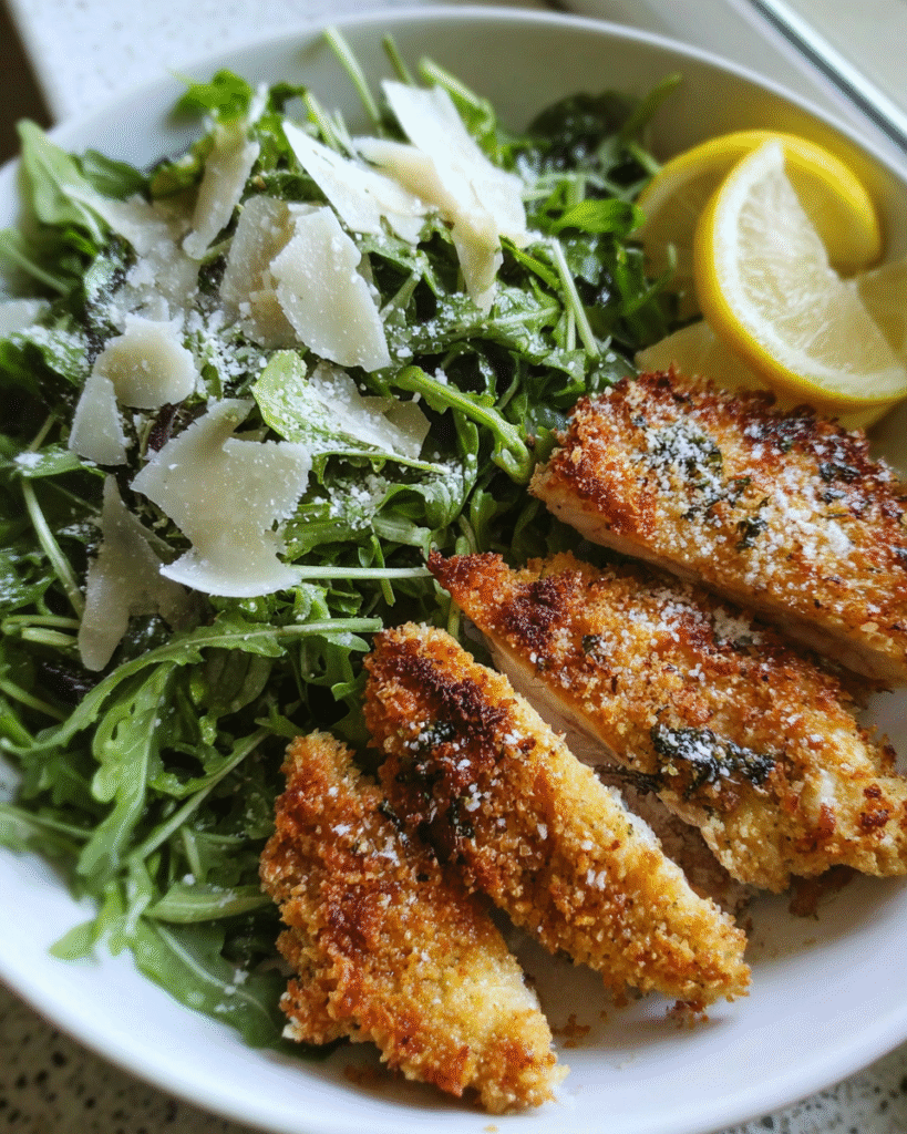 The beauty of this dish lies in its contrast. The chicken emerges from the oven with a crisp parmesan crust, while the arugula salad adds brightness and peppery freshness. Each forkful delivers crunch, savory richness, and a burst of lemon that keeps the entire plate lively.