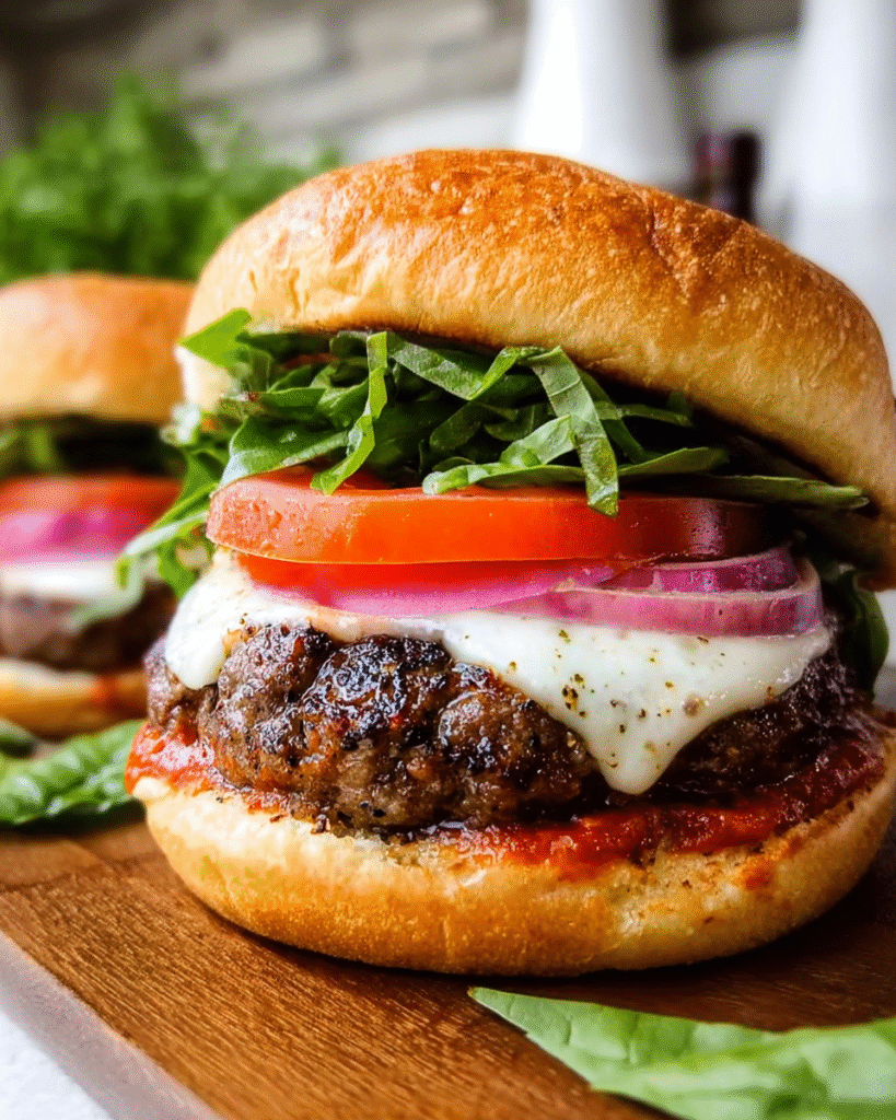 A juicy grilled beef burger inspired by classic pizza flavors, topped with melted mozzarella, warm pizza sauce, and fresh basil.
