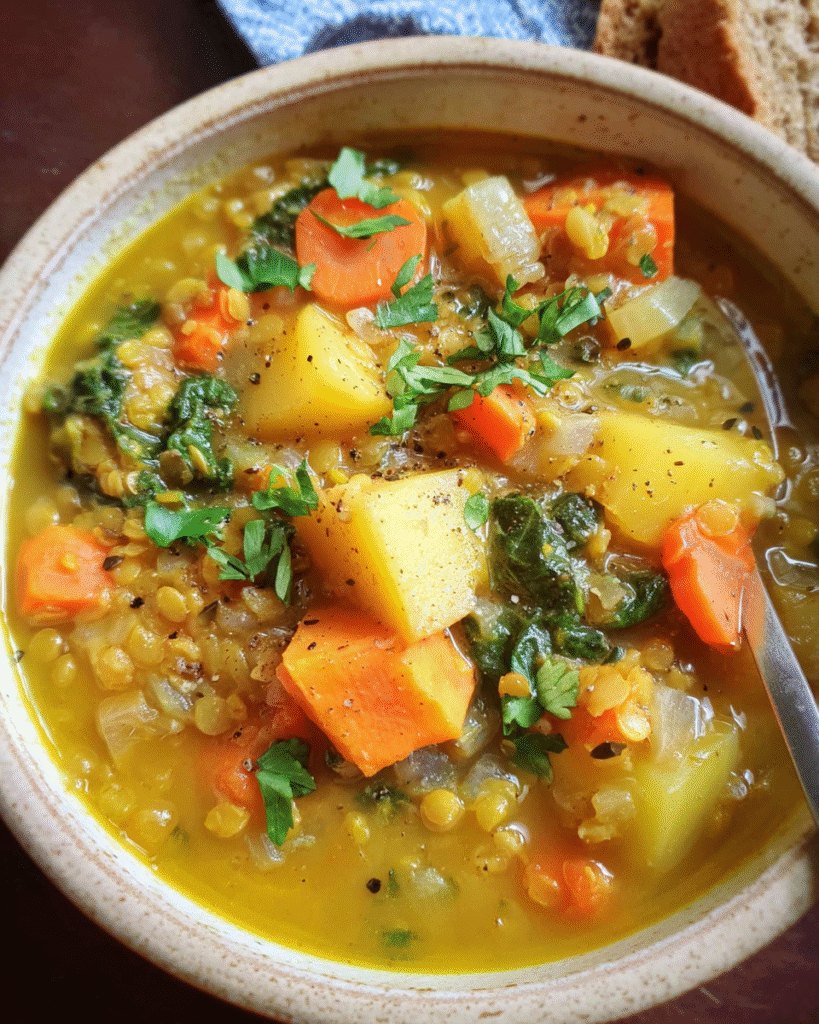 With red lentils as the protein-rich base, this soup provides sustained energy while being easy to digest. The combination of ginger, garlic, and turmeric creates a flavorful broth that helps soothe inflammation and supports the immune system. Parsnips or sweet potatoes bring a touch of sweetness, and leafy greens add freshness and vitamins right at the end.