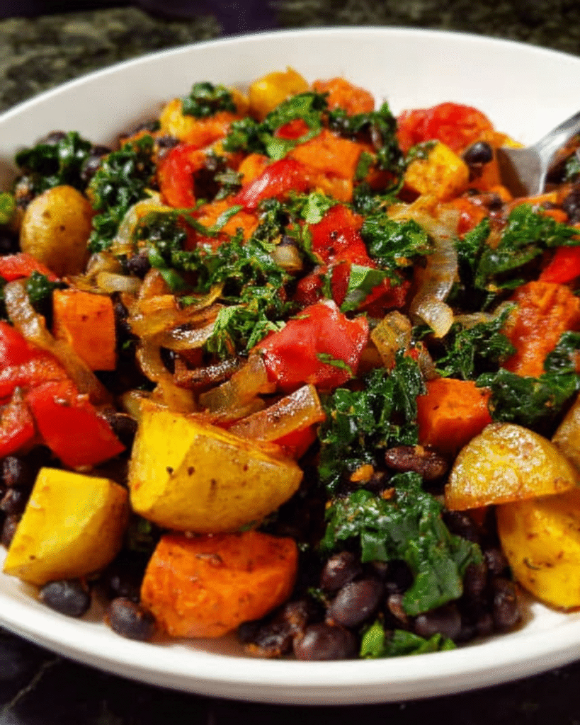 Vegetable hash works beautifully for breakfast. Many people enjoy serving it with eggs, toast, or avocado in the morning. The potatoes provide energy while the vegetables and beans add nutrients, making it a balanced way to start the day.