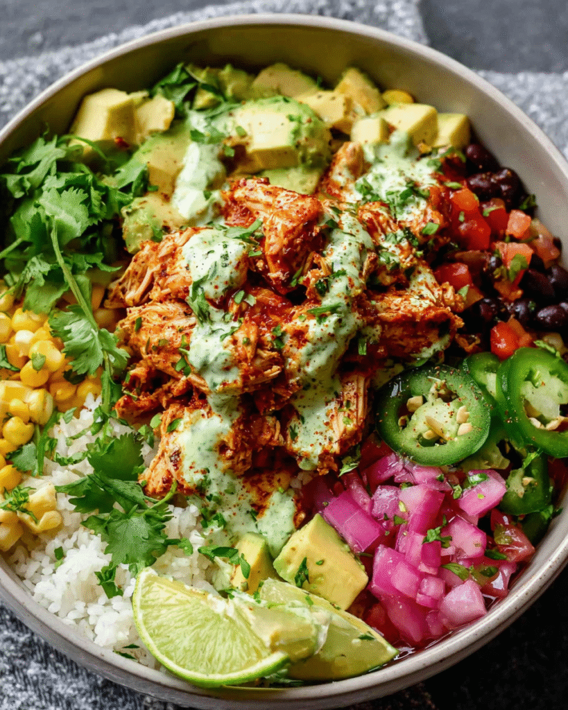 Tender shredded chicken cooked with salsa, black beans, and corn, finished with a bright cilantro-lime crema. Perfect for easy Tex-Mex bowls, tacos, or weeknight dinners.