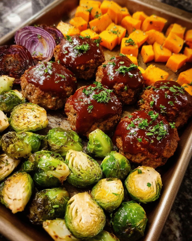 A comforting one-pan dinner featuring tender mini meatloaves glazed with barbecue sauce and roasted Brussels sprouts and sweet potatoes.