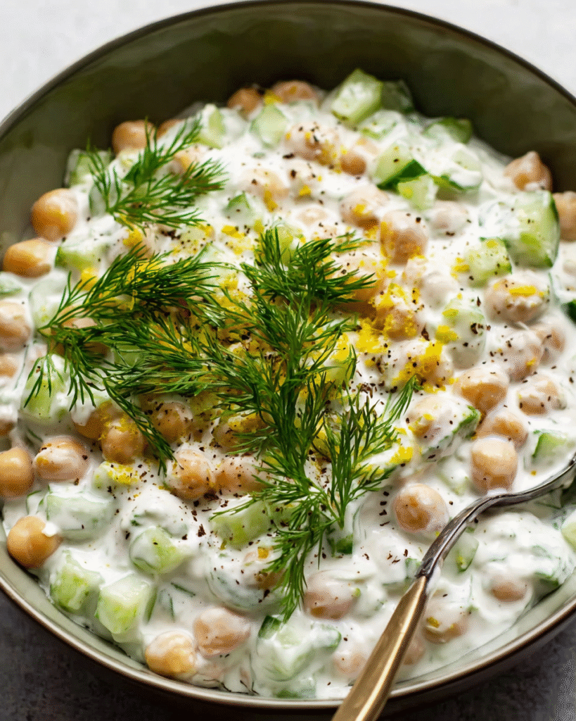 A refreshing Mediterranean chickpea salad tossed in a creamy tzatziki-style dressing made with Greek yogurt, cucumber, garlic, lemon, and fresh dill.