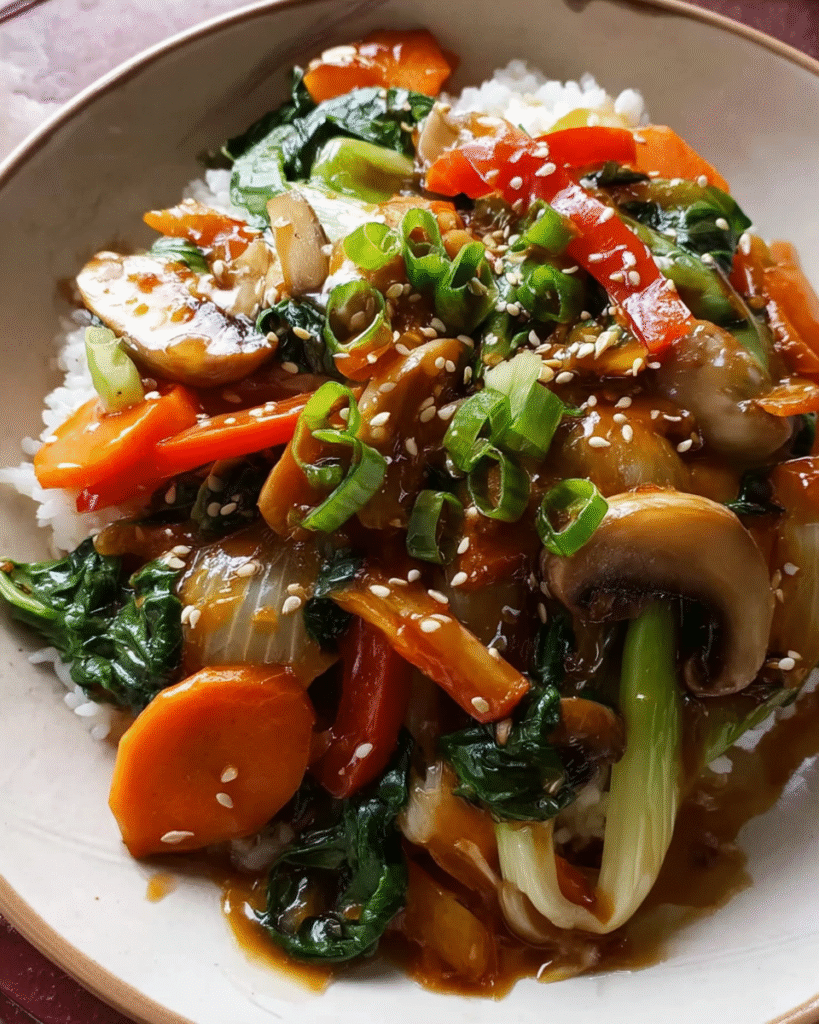The beauty of a great Vegetable Stir Fry begins with fresh produce. Crisp carrots, tender bok choy, earthy mushrooms, and sweet bell peppers create layers of texture that keep every bite interesting.